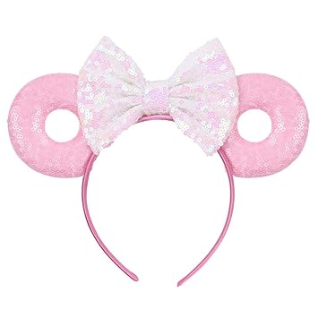 Minnie Mouse Donut Ears with Pink Icing Light Blue Sparkly Bow on a Light Pink Headband. Plus the bow is a beautiful light pink with sequins. The description from Disney-.